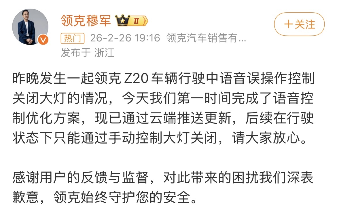 2月26日晚,针对近日领克Z20在夜间高速行驶过程中因语音指令识别错误(语音误操作),导致车辆大灯被意外关闭并引发事故一事,领克汽车销售有限公司副总经理穆军在社交平台上公开回应:“昨晚发生一起领克Z20车辆行驶中语音误操作控制关闭大灯的情况,今天我们第一时间完成了语音控制优化方案,现已通过云端推送更新,后续在行驶状态下只能通过手动控制大灯关闭。”