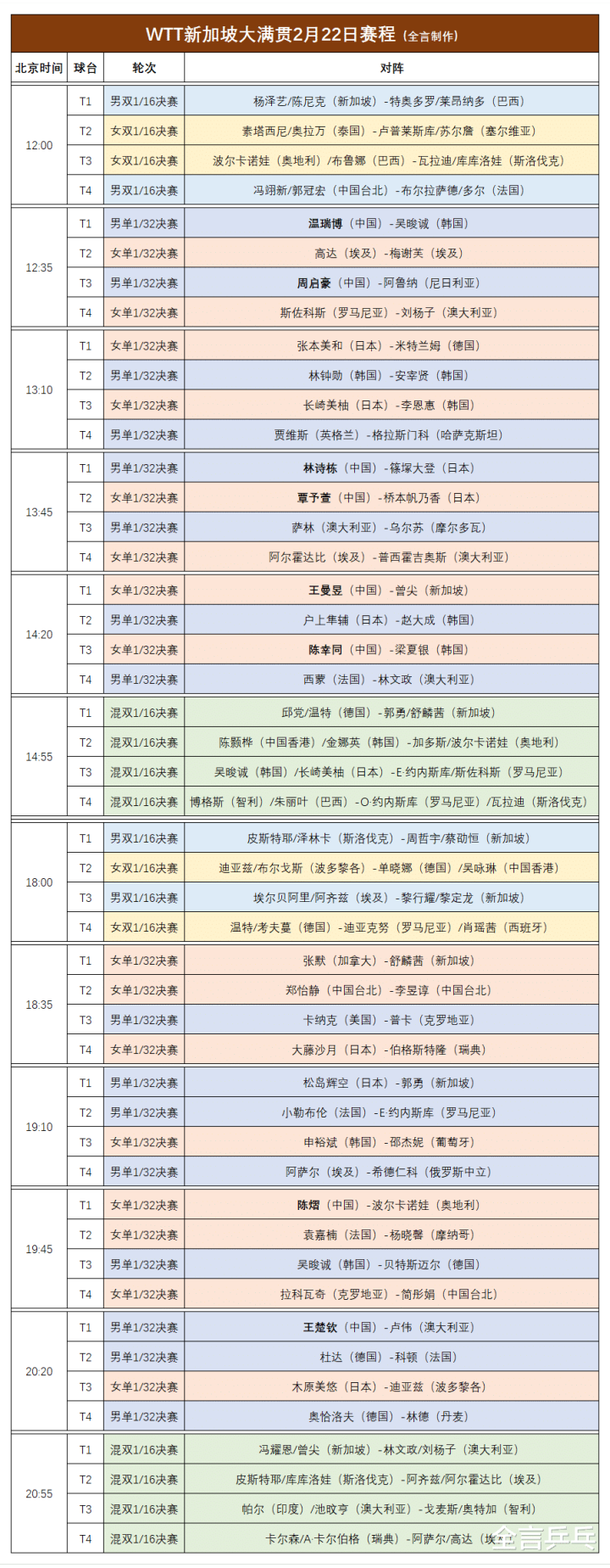 2026年2月22日,乒乓球WTT新加坡大满贯赛将继续进行,目前资格赛阶段的较量已经全部结束,中国队暂未登场,外协会多位名将被淘汰;接下来国乒选手将在正赛首日开启农历马年的首战,迎接8场外战考验,其中与日本运动员对阵2场,阻击世界冠军篠塚大登、削球名将桥本帆乃香,奥运冠军王楚钦、王曼昱等人则会与其他协会运动员过招,详情请看下文。