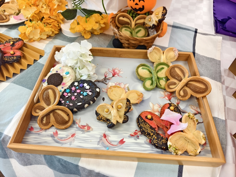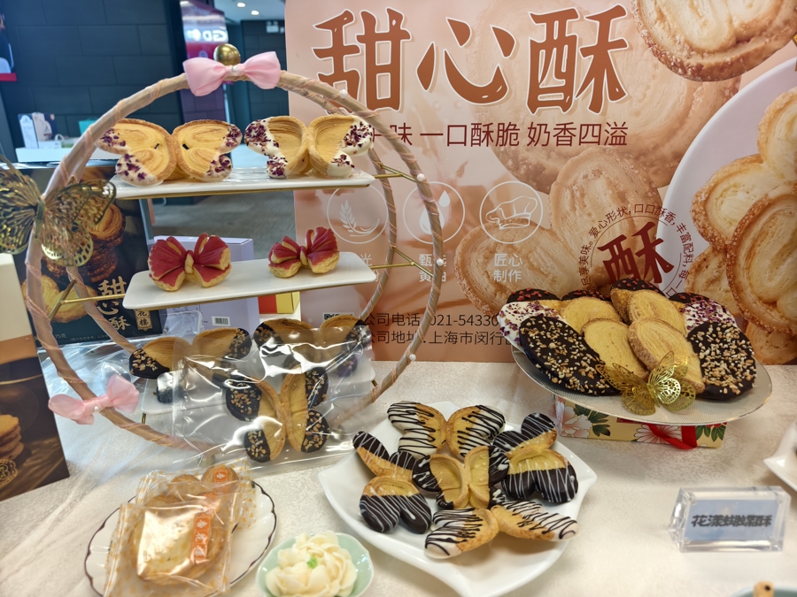 邵万生今年带来全新伯爵红茶味蝴蝶酥,粉红外衣格外吸睛,其烘焙师童威透露:“去年参赛研发的糟香蛋黄款已上市,今年新品也会落地门店,独立小包装方便食用易融资,销量很可观。” 展示区同样亮眼:锦江国际饭店摆出白巧克力玫瑰、黑松露芝士等口味蝴蝶酥,搭配老照片、国风陶瓷,满是老上海风情;老香斋则以蓝紫色调搭珍珠、蕾丝布景,马卡龙色蝴蝶酥缀着亮闪糖粒,精致感拉满。