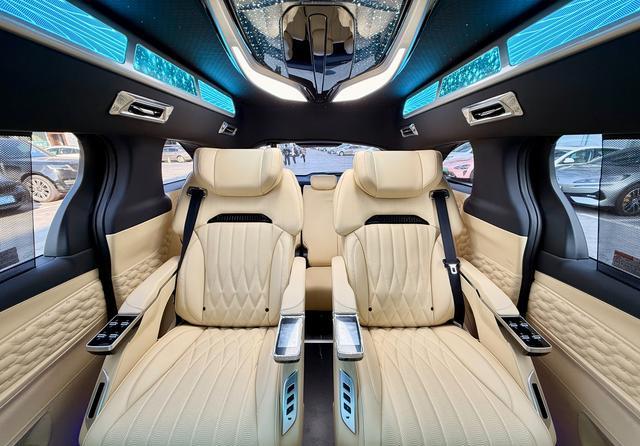 ? 沉浸式娱乐系统:车顶集成了4K高清吸顶电视和BOSE定制音响系统,配合无线耳机接口,无论是商务演示还是家庭观影,都能带来沉浸式体验。